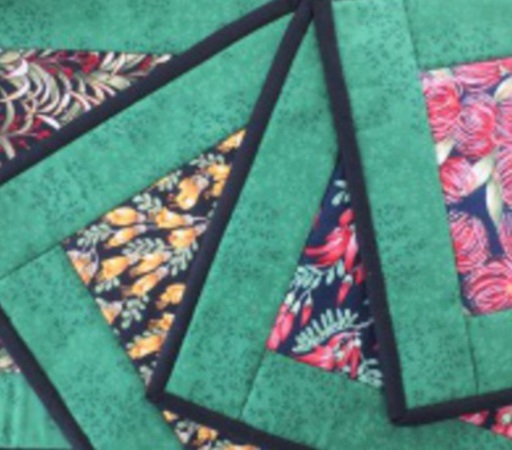 A set of 4 table mats with 4 different New Zealand flowers. Very attractive. Batik borders and black binding. Fully washable and hard wearing.