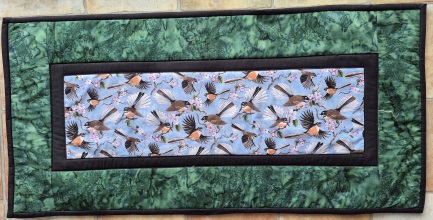 The table runner features a New Zealand inspired central panel of Fantails flying in a blue sky. It is bound in black with a batik border. Approximately 75cm (29in) long, 37cm (14½in) wide. Machine washable. There are many different batik borders available to suit your decor.